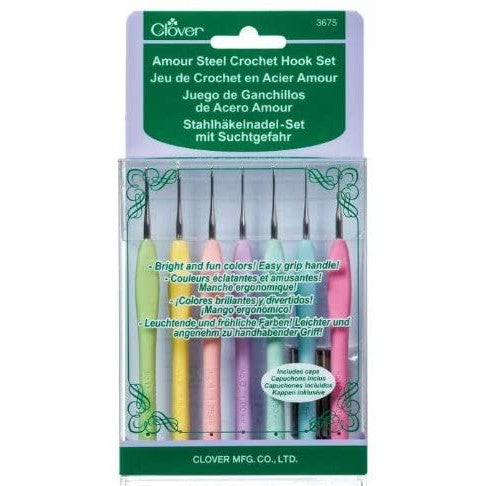 This Clover No.3675 Amour Steel Crochet Hook Set is designed with elastomer rubber handles for comfortable, stress free manipulation and reduced fatigue.